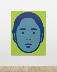 Alongside, Opie exhibits for the first time large-scale, hand-painted portraits. Initiated by a fleet of faces captured on a recent trip to India, his front-on, floating heads are reduced to their purest physical form, practically symmetrical if not for their separate hair styles. Employing a limited, bold colour palette borrowed from vibrant Hindu iconography and the brightly painted facades of houses in Southern India, each emblematic outline is randomly allocated a three-colour combination, as the artist begins to entertain the possibilities of emerging AI technology to entirely outsource portrait production.